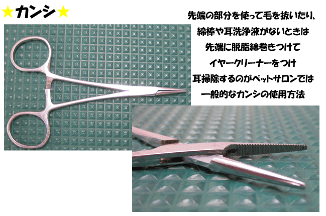 耳の中の毛を処理するときに使う、便利なアイテムを手に入れました。正式名称は不明なので、ペットサロンキキでは「耳の中の毛を切るカンシ」と呼んでいます。毛を切るといっても先端に鋭利な刃がついているわけではないので安心して使える優れものです。